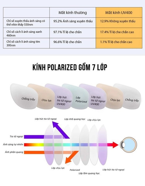 Khi ánh sáng phản xạ (ánh sáng phân cực ngang) chiếu vào tròng kính, lớp màng lọc sẽ hấp thụ hoặc ngăn chặn chúng, chỉ cho phép ánh sáng phân cực dọc đi qua. Kết quả là, ánh sáng chói lóa bị loại bỏ, giúp mắt nhìn rõ ràng và thoải mái hơn. Đồng thời, độ tương phản và độ sắc nét của hình ảnh cũng được cải thiện.