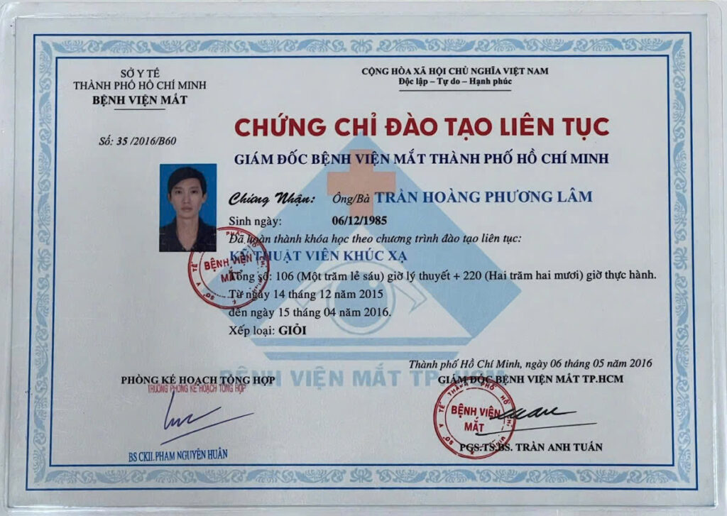 - Chức vụ: Kỹ thuật viên khúc xạ & gia công kính thuốc
