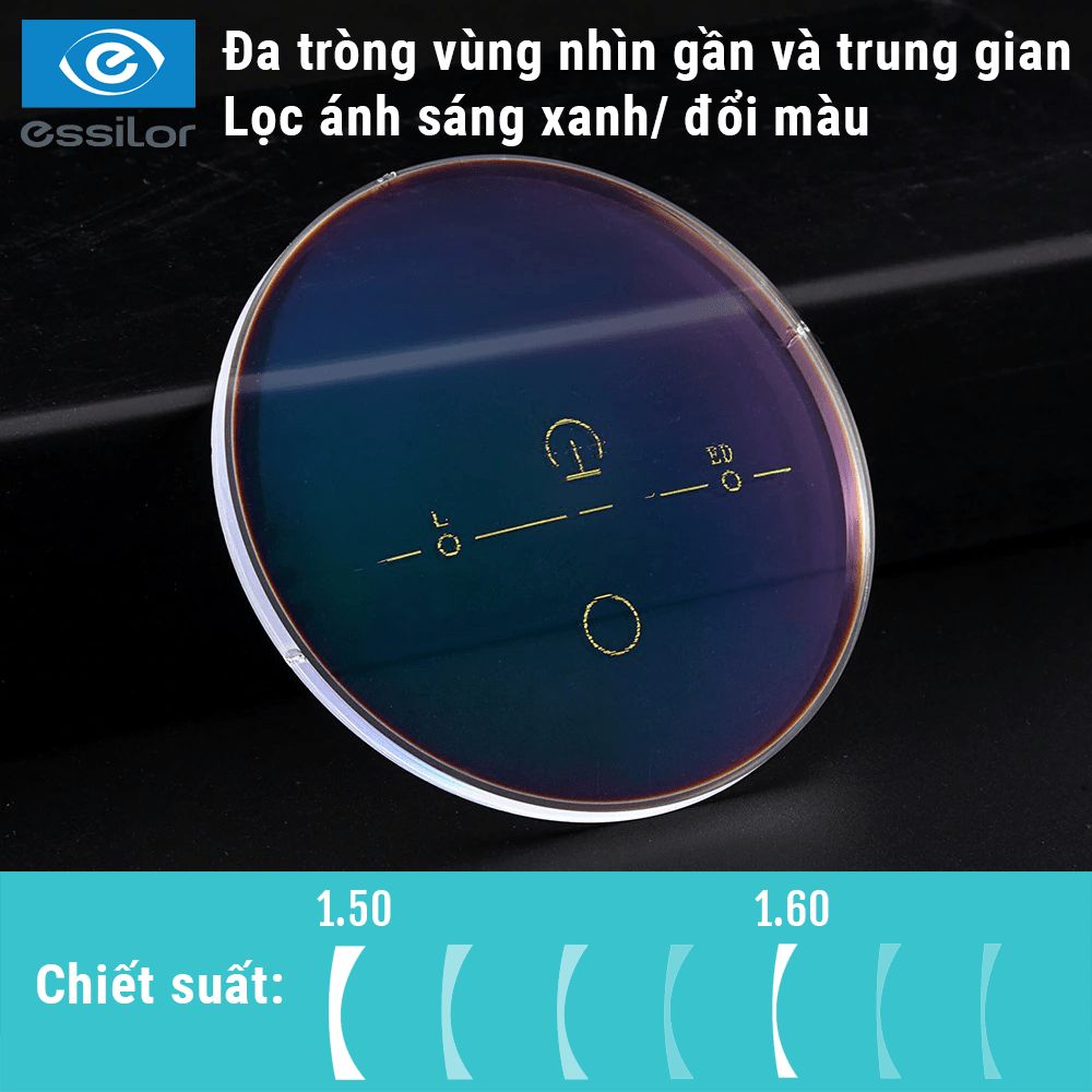- Tròng kính đa tròng chống ánh sáng xanh Essentials Home & Work MaxAz: Kết hợp tính năng lọc ánh sáng xanh thông minh bằng chất liệu tròng BlueUV Capture
