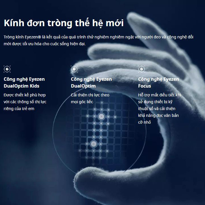 Eyezen là công nghệ tròng kính chống mỏi mắt: được thiết kế chính xác theo thị lực và độ tuổi mỗi khách hàng, vì thế sản phẩm được chia thành 2 hệ tròng kính: Eyezen Start và Eyezen Boost