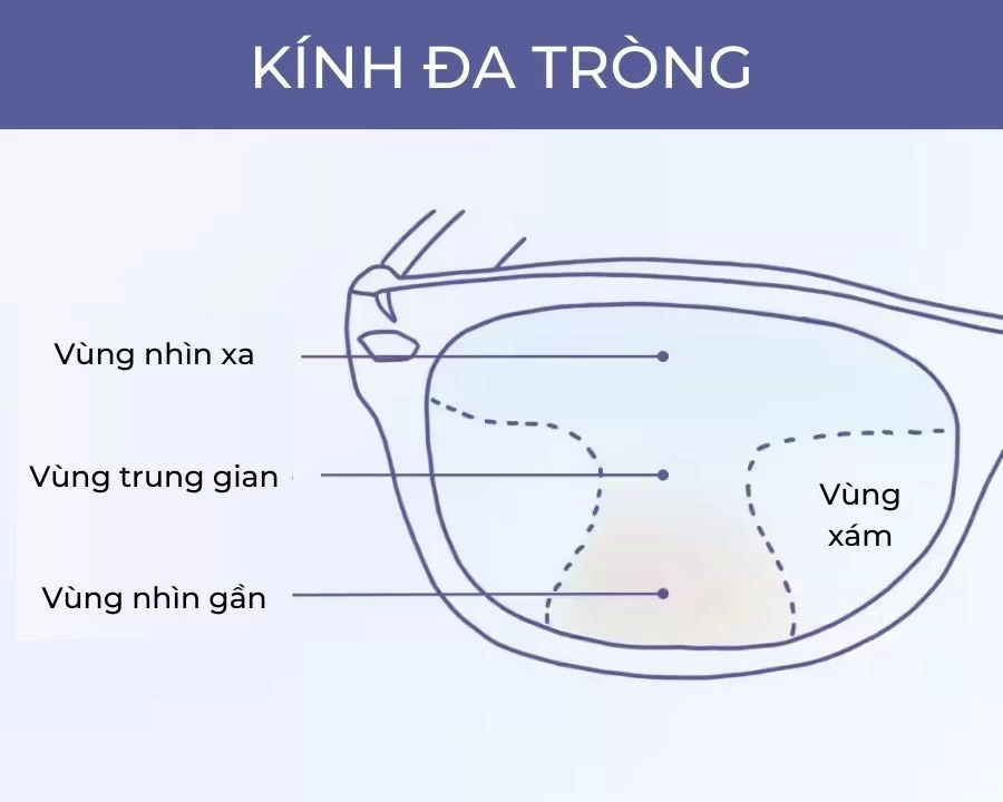 Vùng nhìn trung gian (ở giữa tròng kính): Hỗ trợ tầm nhìn ở khoảng cách trung bình, như làm việc trên máy tính, nhìn bảng trong phòng họp hoặc giao tiếp với người đối diện.