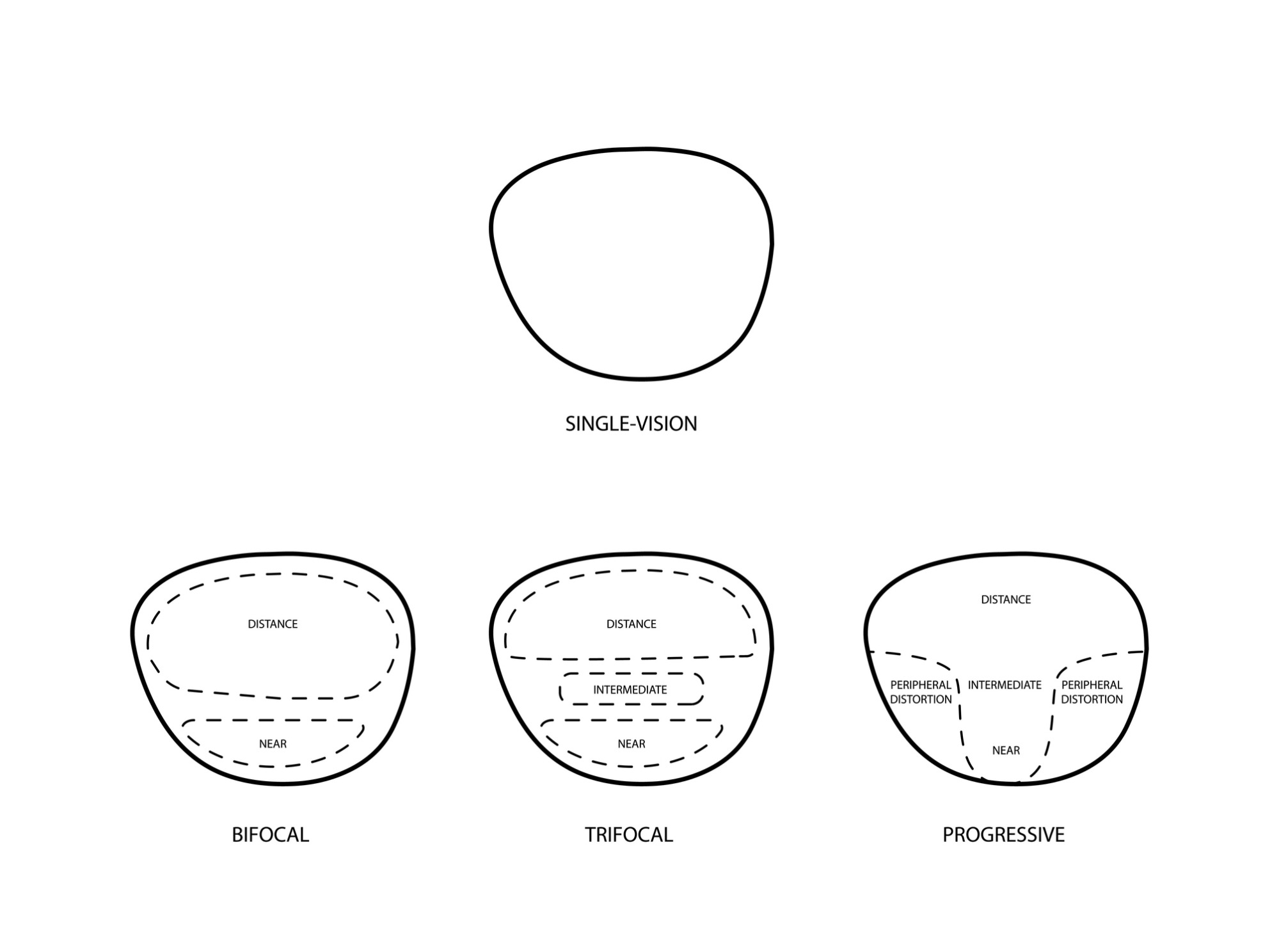 Kính đa tròng được chia thành nhiều loại dựa trên số lượng vùng độ hội tụ trên tròng kính. Dưới đây là ba loại phổ biến: